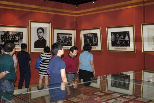 纪念馆由一个时空隧道、八个展厅、两个体验馆,一个放映馆、一个革命教育会议室构成。在讲解员的带领下,党员师生通过一条气势恢宏、象征长征精神的时空隧道,一尊毛主席铜像威严屹立于时空隧道的顶端,两侧的高清LED巨屏纪录了以毛泽东为代表老一辈无产阶级革命家从1921年至1949年的丰功伟绩。时空隧道两侧的展墙上展出200多幅毛主席的珍藏老照片,展柜里陈列着具有时代特征各类红色展品,有被誉为“中国飞天第一图”的镇馆之宝——长征万里图、 “国际艺术大师”尔宝瑞老师创作的毛主席蜡像等,也有战争时代的遗留的物品,都展现着革命战争以来我党辉煌的历史记忆。听着讲解员的解说,看着一件件珍贵文物和照片,大家纷纷表示仿佛回到了革