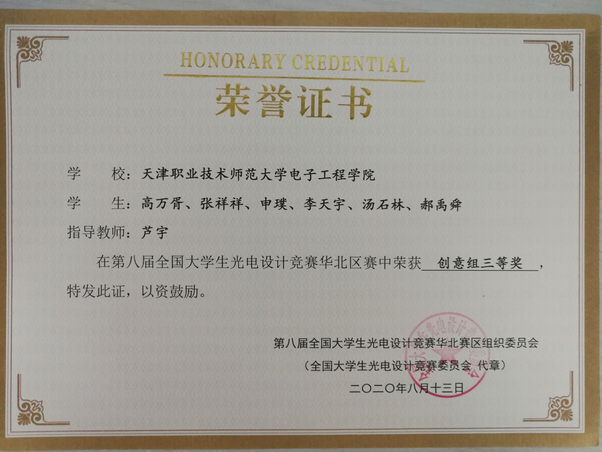 2020年8月13日,第八届全国老员工光电设计竞赛华北赛区决赛在燕山大学举办,竞赛通过腾讯会议线上答辩的形式举行。公司芦宇老师指导、高万胥担任队长,张祥祥、申璞、李天宇、汤石林、郝禹舜共同参加的《基于智能手机的苹果糖度无损测量》赛题,在一众参赛队伍中脱颖而出,荣获三等奖。